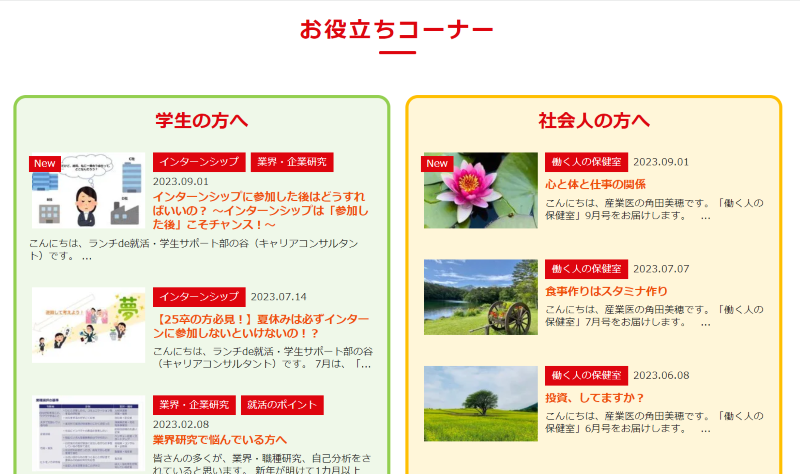 - 産業医の方と社会人有志(プロボノ)の協力を得て、「ランチde就活」ポータルサイトの「お役立ちコーナー(学生向け、社会人向け)」の運営を再開できた。月1本のペースになり、記事の内容も充実してきている。